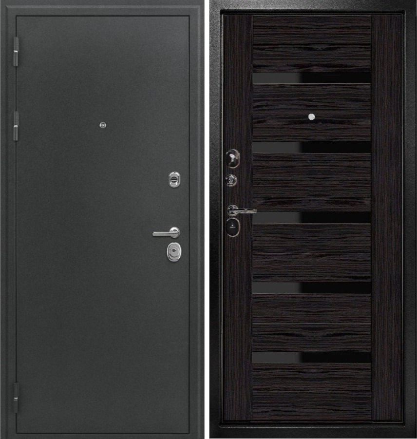 Внешнее/внутреннее покрытие: «Антик серебро» / царга 22 мм венге/ черный лакобель стекла Толщина дверного полотна/короба: 100мм/120мм
